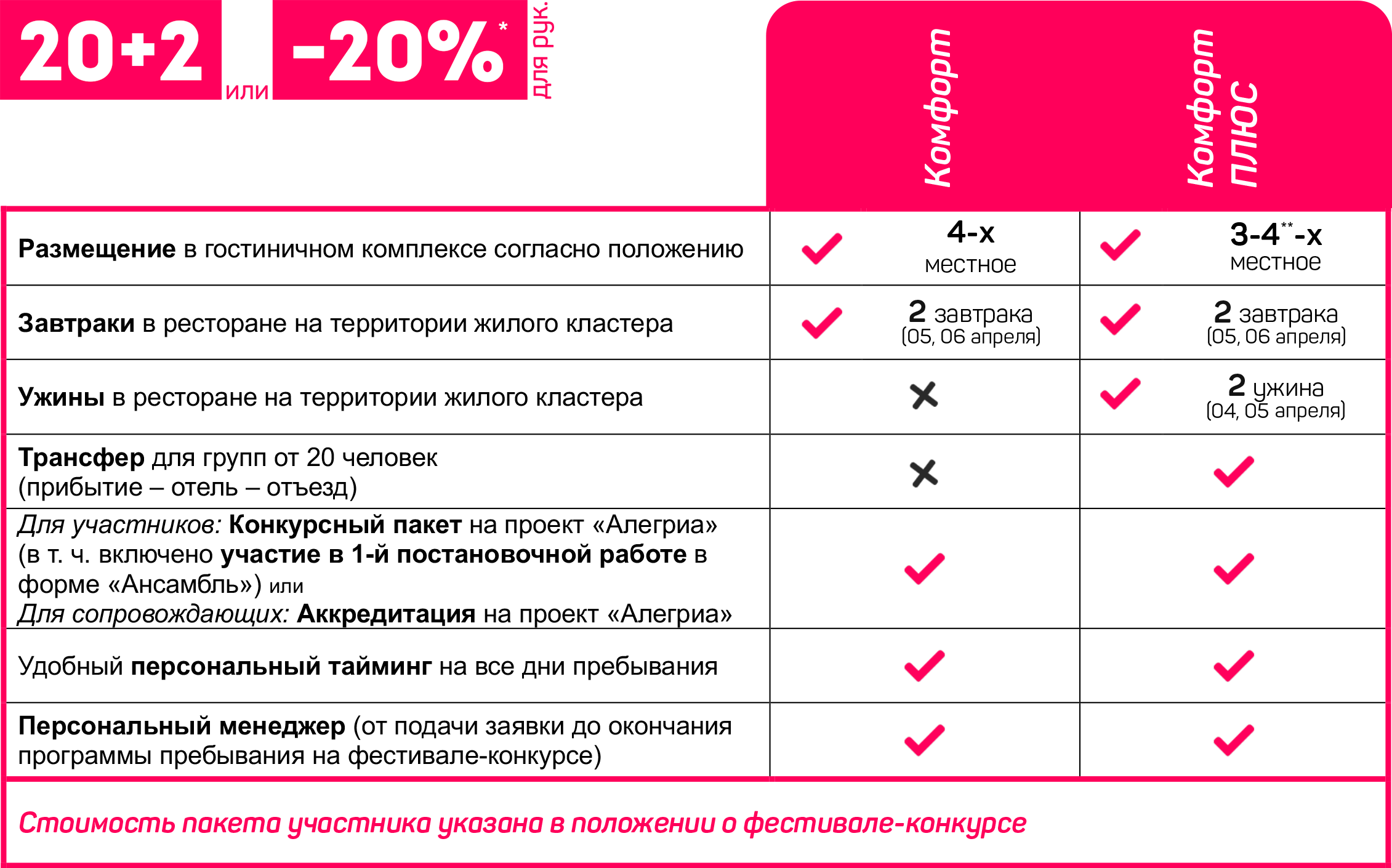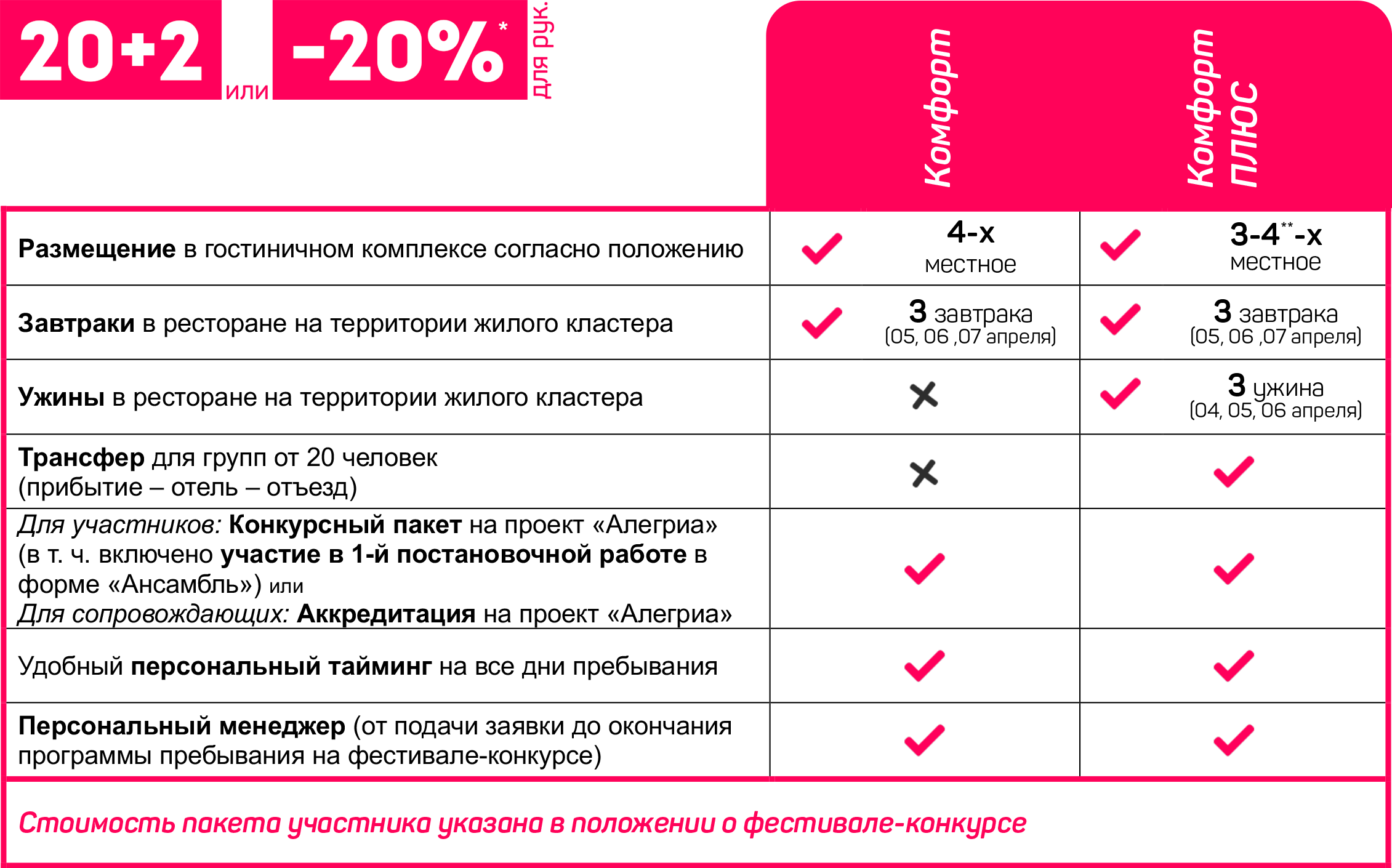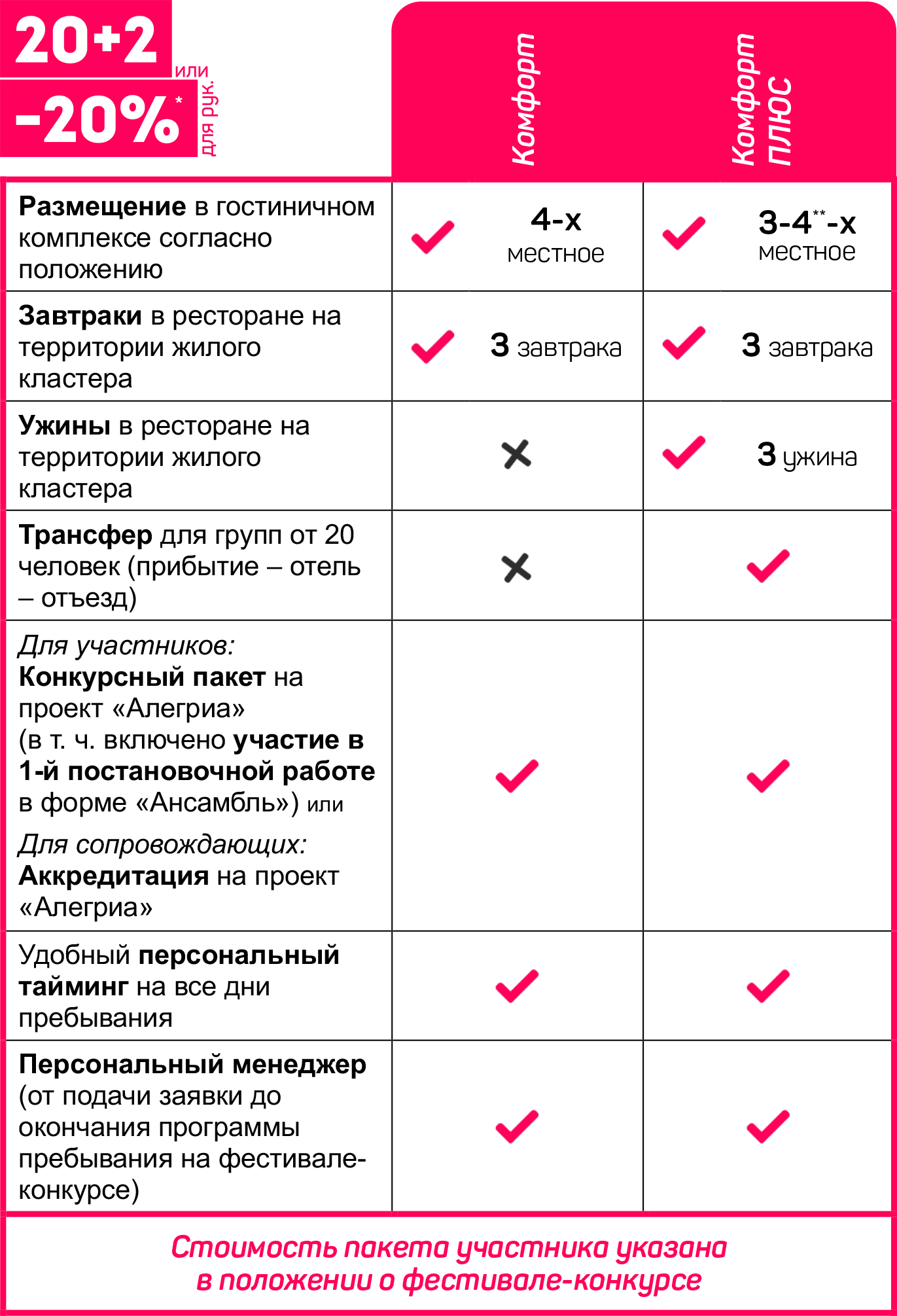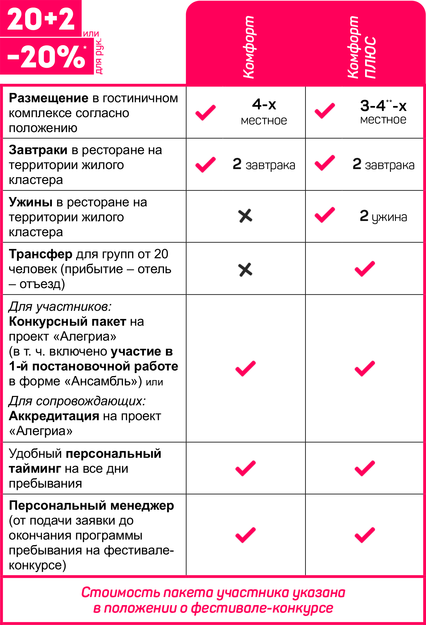 Расшифровка пакетов участника: «Комфорт» и «Комфорт Плюс» - предназначены для иногородних и/или иностранных участников, включает в себя проживание, питание, трансфер и доп. услуги согласно положению, услуги фестиваля и услуги конкурса в запрашиваемом объёме; «Местный» - предназначен для участников, проживающих в черте региона места проведения фестиваля-конкурса или в соседнем регионе/области на удаление не более 250 км от места проведения фестиваля-конкурса и включает услуги фестиваля и услуги конкурса в запрашиваемом объёме; «Самостоятельный» - предназначен для иногородних и/или иностранных участников, пребывающих к месту проведения фестиваля-конкурса самостоятельно и не подпадающие под критерии пакета участника «Местный» включает услуги фестиваля и услуги конкурса в запрашиваемом объёме (не включает: организацию проживания, питания и трансфера).