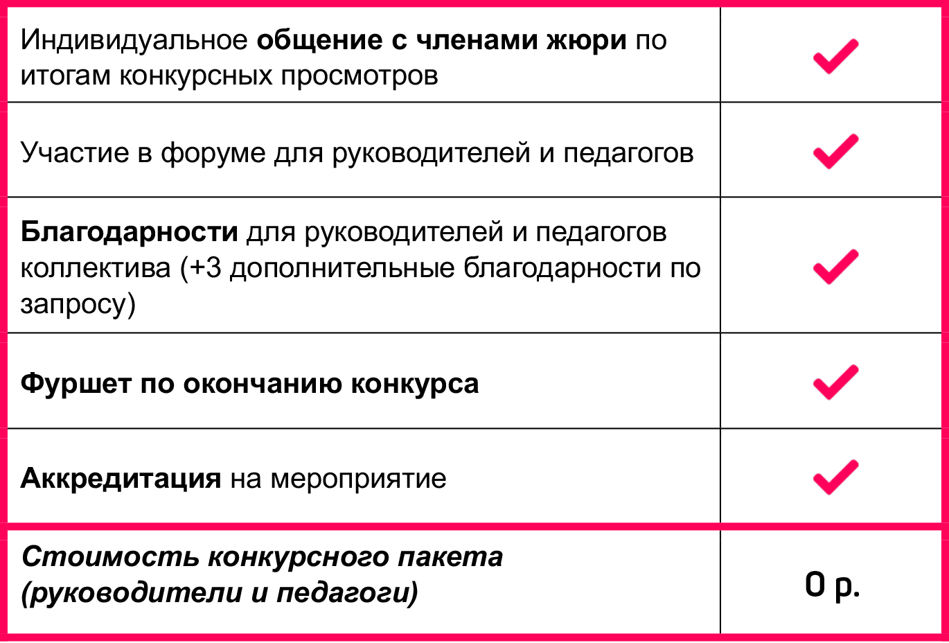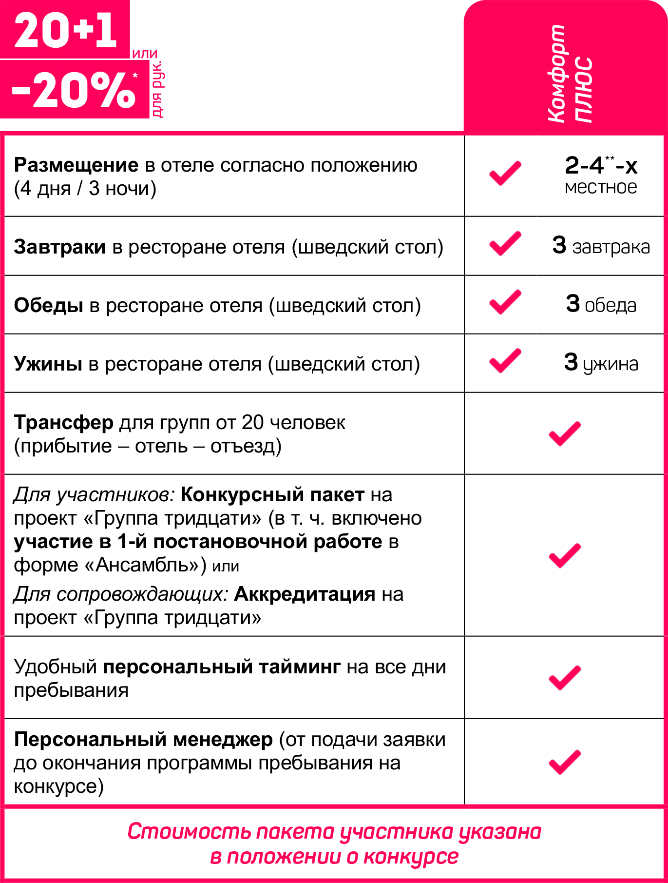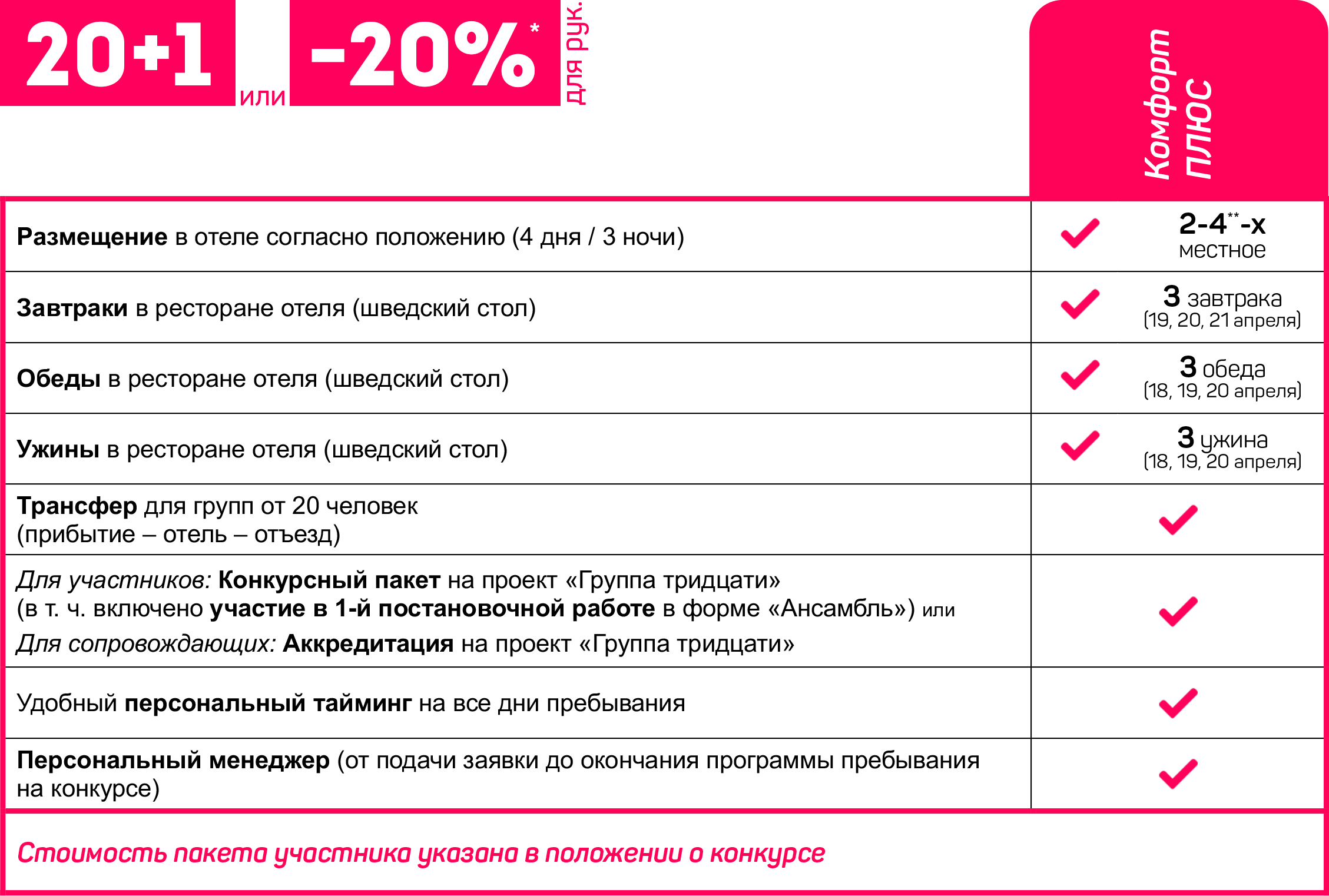 При участии в конкурсе с использованием Гранта «10+1» ввиду отсутствия на проекте пакета участника «Комфорт» коллективу предоставляется единоразовая скидка на участие в проекте в размере 129 000 рублей + 1 бесплатное место для руководителя на условиях, изложенных в применяемом гранте.
