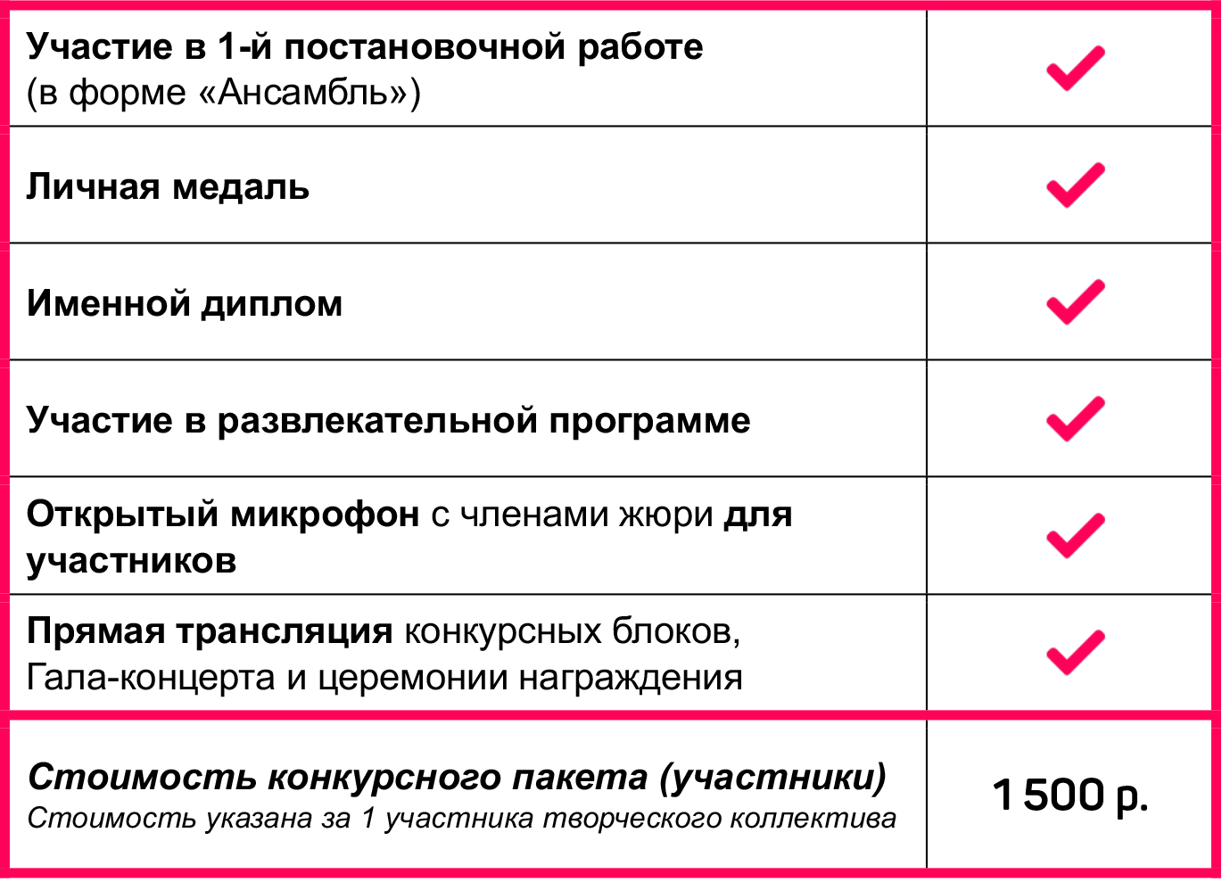 Расшифровка пакетов участника: «Комфорт Плюс» - предназначены для иногородних и/или иностранных участников, включают в себя проживание, питание, трансфер и доп. услуги согласно положению, услуги конкурса в запрашиваемом объёме; «Местный» - предназначен для участников, проживающих в черте региона места проведения конкурса или в соседнем регионе/области на удаление не более 250 км от места проведения конкурса и включает услуги конкурса в запрашиваемом объёме; «Самостоятельный» - предназначен для иногородних и/или иностранных участников, пребывающих к месту проведения конкурса самостоятельно и не подпадающие под критерии пакета участника «Местный» включает услуги конкурса в запрашиваемом объёме (не включает: организацию проживания, питания и трансфера).